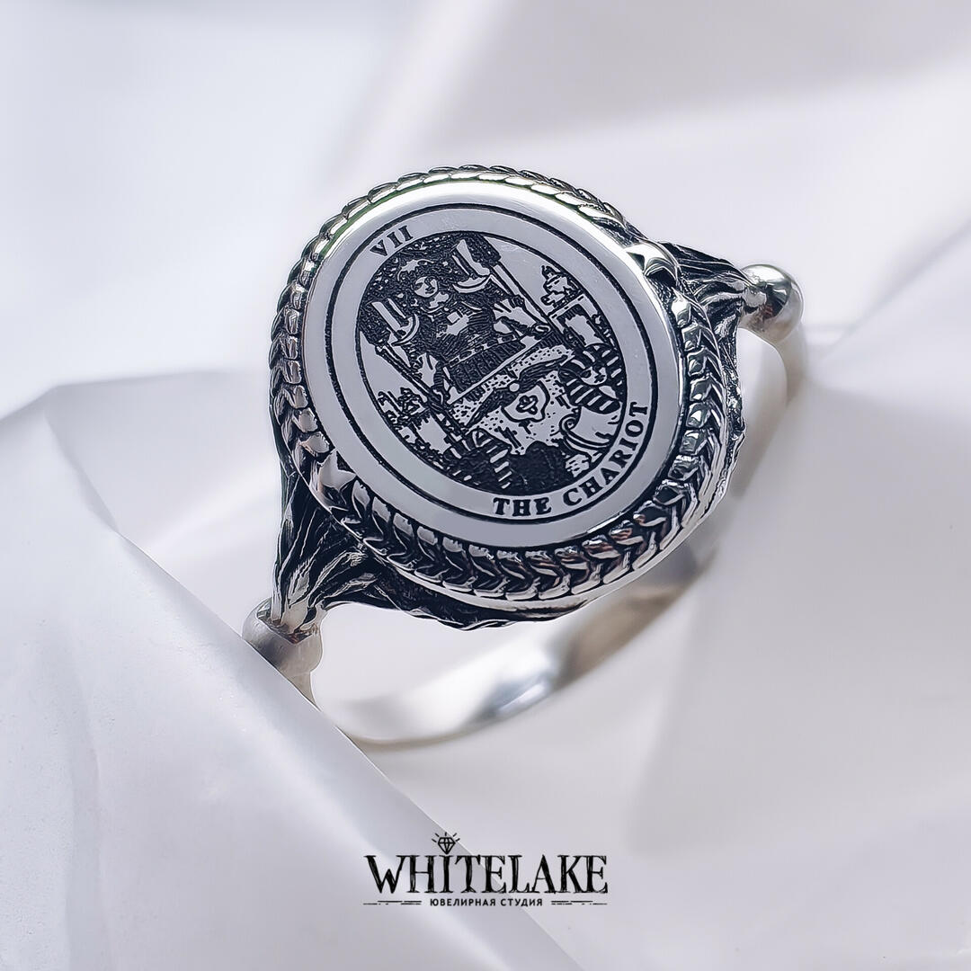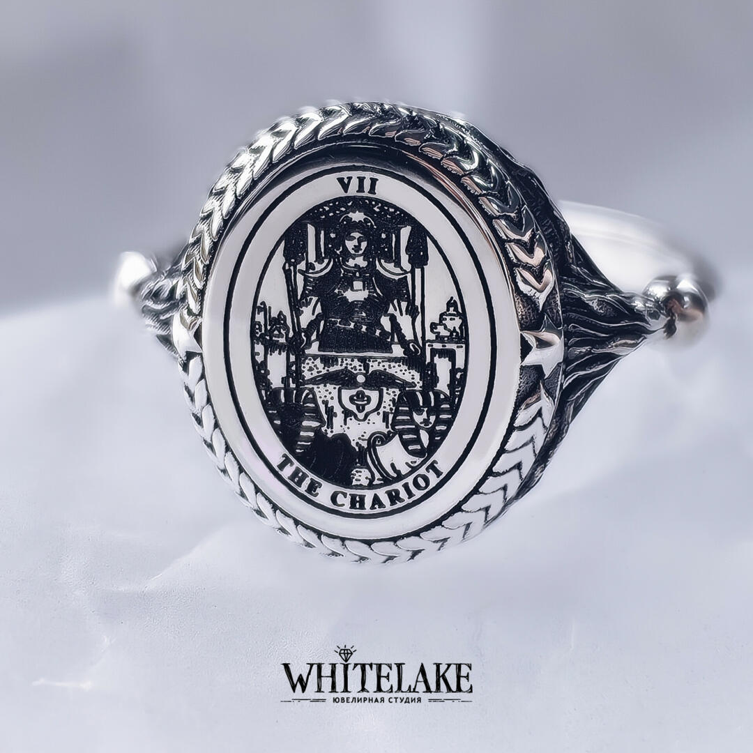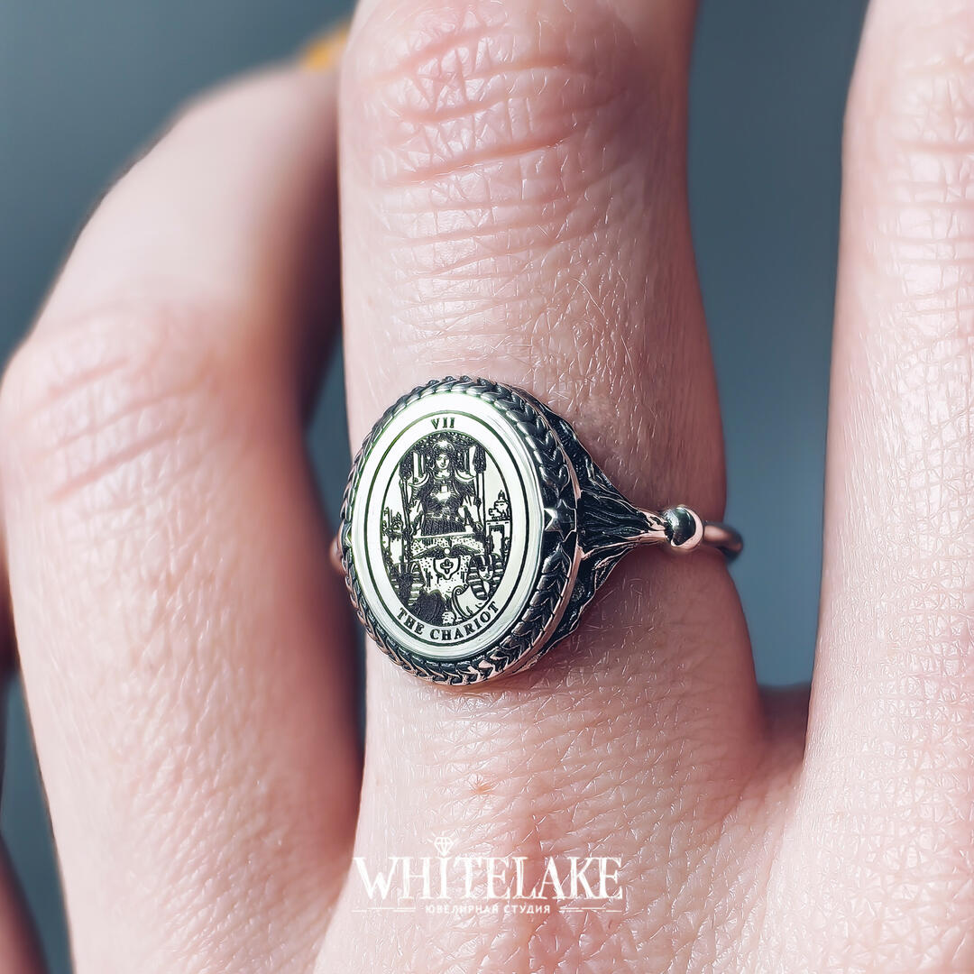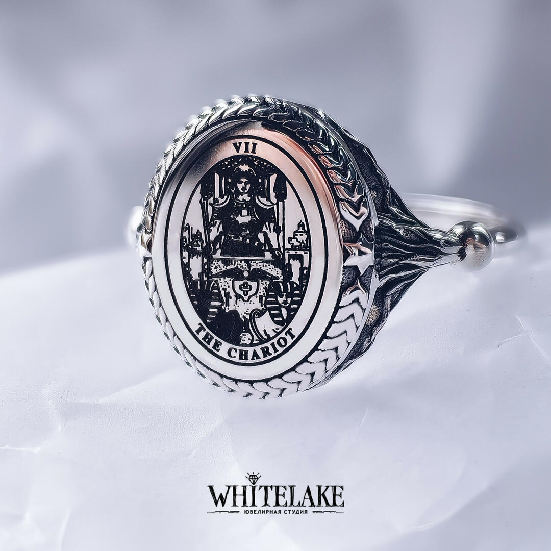 WHITELAKE Кольцо с картой Таро «Колесница» Кольцо с картой Таро «Колесница» на заказ по своим и нашим эскизам. Изготовление ювелирных украшений из золота и других металлов с доставкой по всей России. Ювелирная студия Whitelake: каталог и цены на сайте.