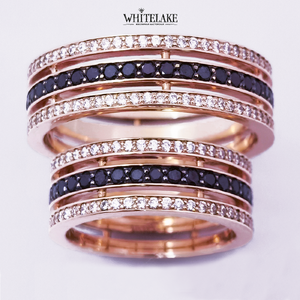 Впрочем, каждому нашему клиенту мы идем навстречу, если он выражает желание что-то изменить в дизайне колец. Например, ширина моделей на фото составляет 7 мм. Дорожка белых бриллиантов шириной 1 мм состоит из 234 камней ~1.17ct каждый. Черных же около 78 штук ~0.39ct каждый, ширина дорожки 1,5 мм. Ширину и количество можно менять, как и сами материалы. Если розовое золото по каким-то причинам вам не подходит, кольца можно изготовить из белого или желтого, а также из серебра или платины.