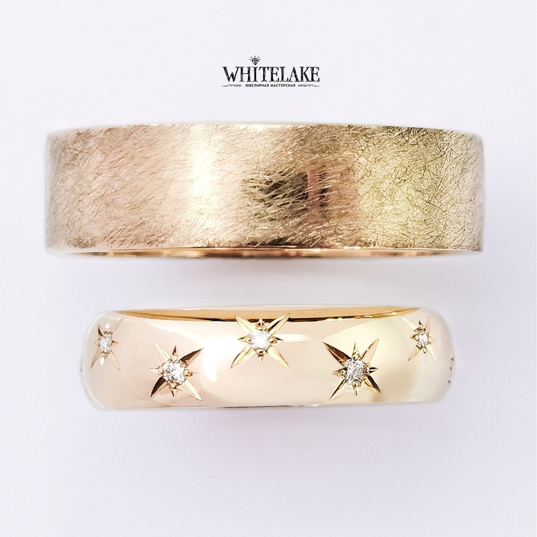 - Вы можете выбрать разный металл для каждого кольца. Например, мужское в серебре, женское в золоте;