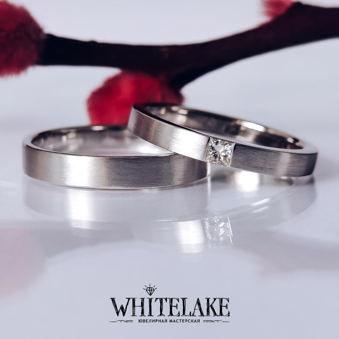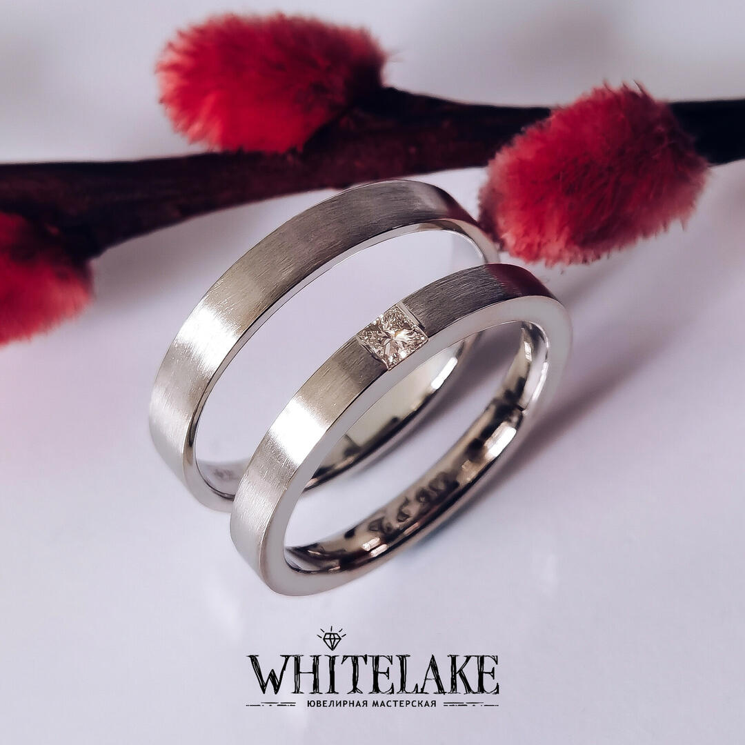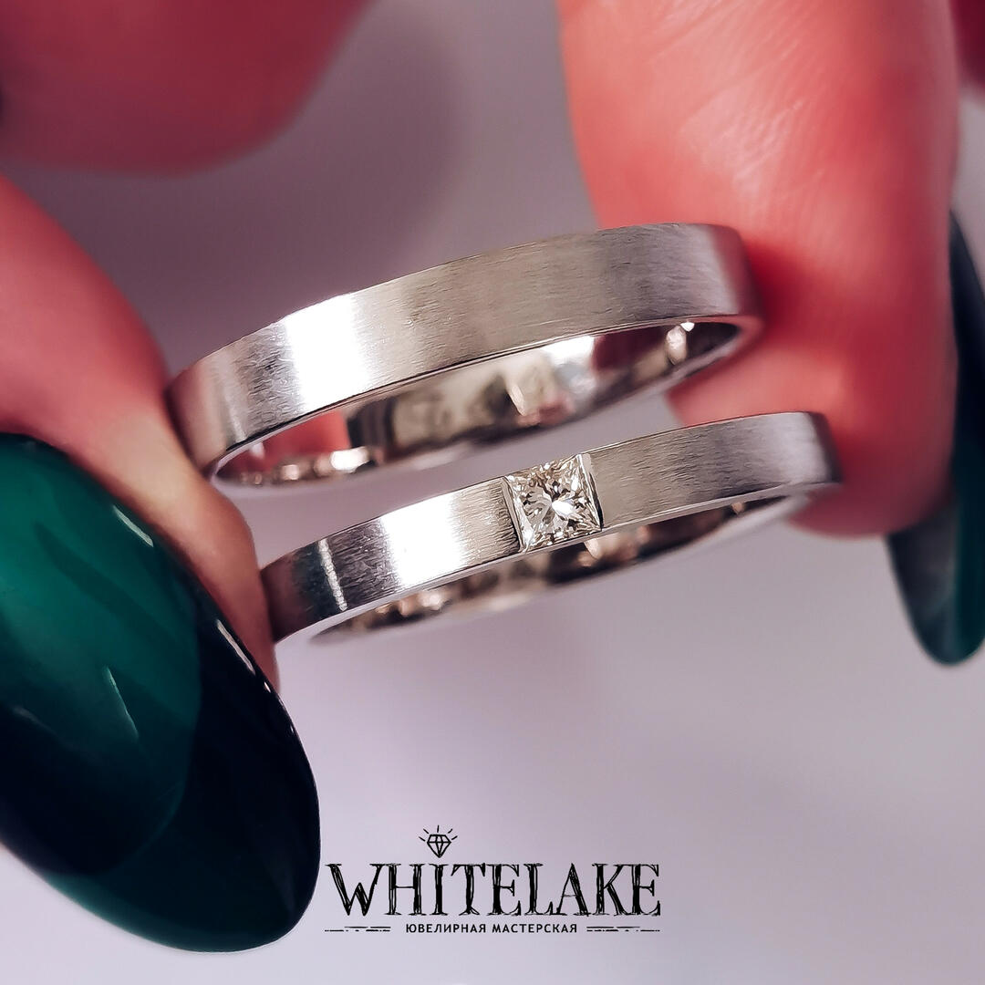 WHITELAKE Обручальные кольца из белого золота с бриллиантом огранки принцесса Обручальные кольца из белого золота с бриллиантом огранки принцесса - на заказ. Изготовление эксклюзивных колец в ювелирной студии Whitelake с доставкой по России. Создаем уникальные ювелирные украшения по своим и вашим эскизам из золота, платины и серебра с драгоценными и полудрагоценными камнями и гравировкой.