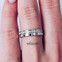 Дизайн кольца невесты тоже нельзя назвать сложным. Бриллиантовая дорожка по всей длине окружности на одной половине и одинаковые рельефные квадратики – на другой. Лаконичные и простые детали, которые в сочетании друг с другом выглядят эффектно, изящно и женственно.