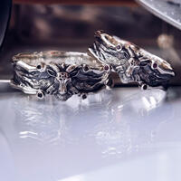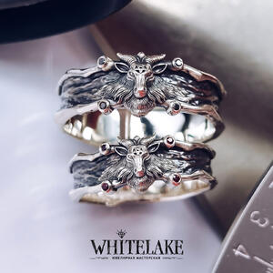 Серебряные с чернением козлиные головы с перевернутой звездой во лбу окружены самоцветами: