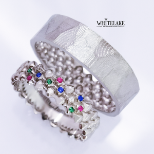WHITELAKE Парные обручальные кольца с драгоценными камнями Парные обручальные кольца с драгоценными камнями - на заказ. Изготовление эксклюзивных колец в ювелирной студии Whitelake с доставкой по России. Создаем уникальные ювелирные украшения по своим и вашим эскизам из золота, платины и серебра с драгоценными и полудрагоценными камнями и гравировкой.