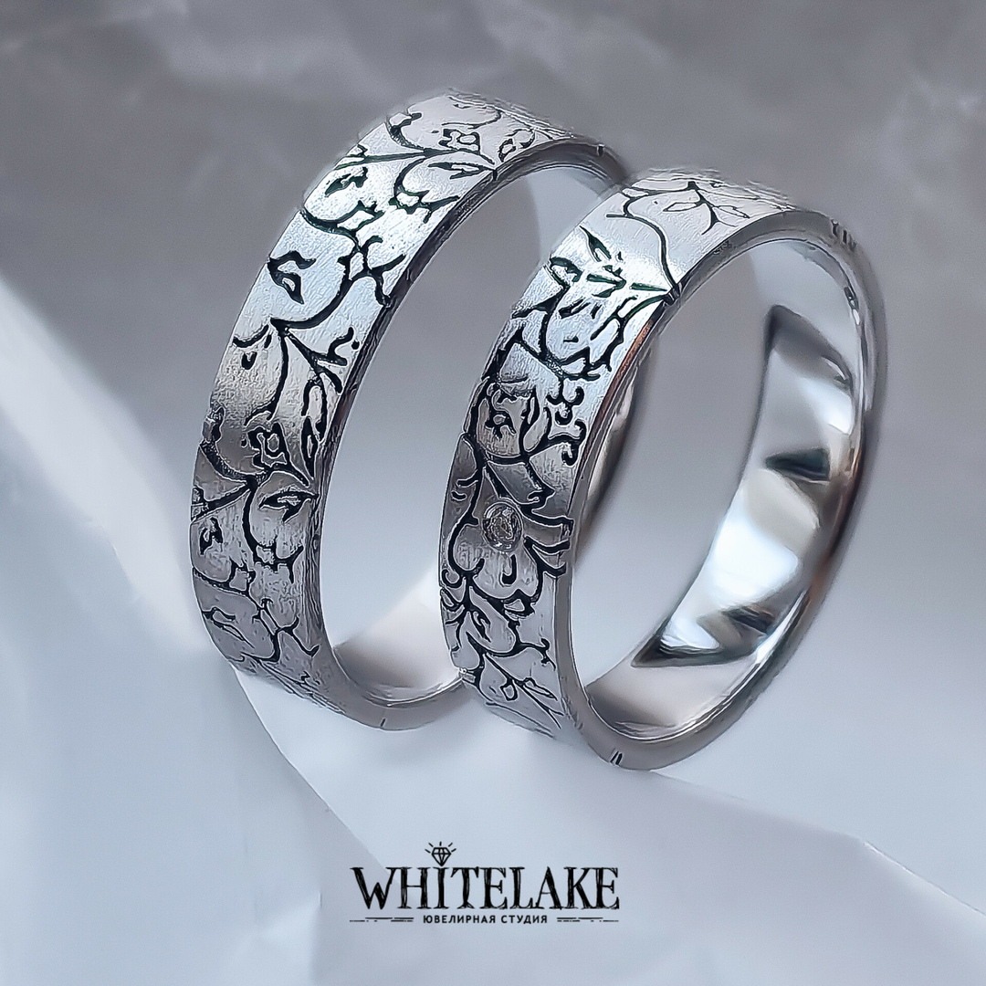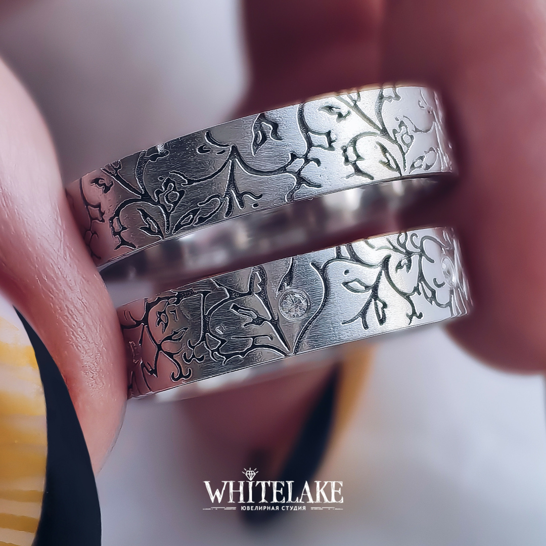 WHITELAKE Парные обручальные кольца с природным орнаментом Парные обручальные кольца с природным орнаментом - на заказ. Изготовление эксклюзивных колец в ювелирной студии Whitelake с доставкой по России. Создаем уникальные ювелирные украшения по своим и вашим эскизам из золота, платины и серебра с драгоценными и полудрагоценными камнями и гравировкой.