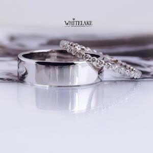 Пара удивительной красоты, от которой невозможно оторвать взгляд... Широкое совершенно гладкое, блестящее мужское кольцо-шайба и тоненький, изящный, невероятно хрупкий с виду ободок из бриллиантов для невесты. Поразительный контраст, делающий эти обручальные кольца столь эффектными.