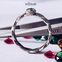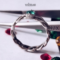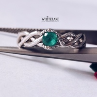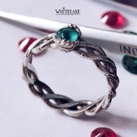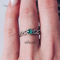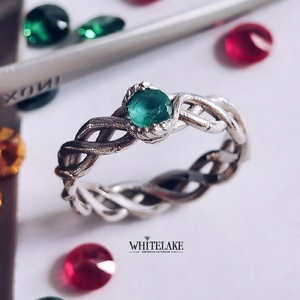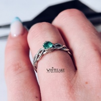 Основа выполнена словно из гибких прутьев: даже своей фактурой они напоминают растение – словно кто-то буквально сплел это кольцо и покрыл серебром. Кончики одной из ветвей заканчиваются листьями, бережно обнимающими прекрасный зеленый изумруд. Камень обработан так, чтобы его блеск не ослеплял: он спокойно мерцает изнутри, как бы сквозь дымку, как будто минерал долгие столетия пролежал в породе, прежде чем стать частью кольца.