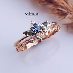 На самом деле, это два кольца, создающие неповторимый дуэт. Первое – фигурное, формой напоминающее венок из листьев, с тремя аккуратными белыми бриллиантами. Второе – тонкий гладкий ободок, похожий на диадему принцессы, с лепестками из зеленого сапфира и распускающимся между ними голубым сапфировым же цветком.