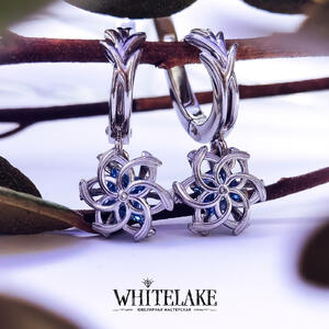 Для изготовления украшения ювелиры выбрали благородное серебро, инкрустировав его прелестными голубыми топазами Swiss. Серьги «Нэнья» горят каплями ранней росы, переливаются, сияют, манят.
